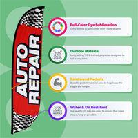 Bring the traffic straight to your garage with this high-impact Auto Repair feather flag—designed to stand out and drive customers in. Featuring a bold red background, racing-style black and white checkers at the top and bottom, and large vertical white “AUTO REPAIR” lettering, this flag screams speed, service, and reliability.