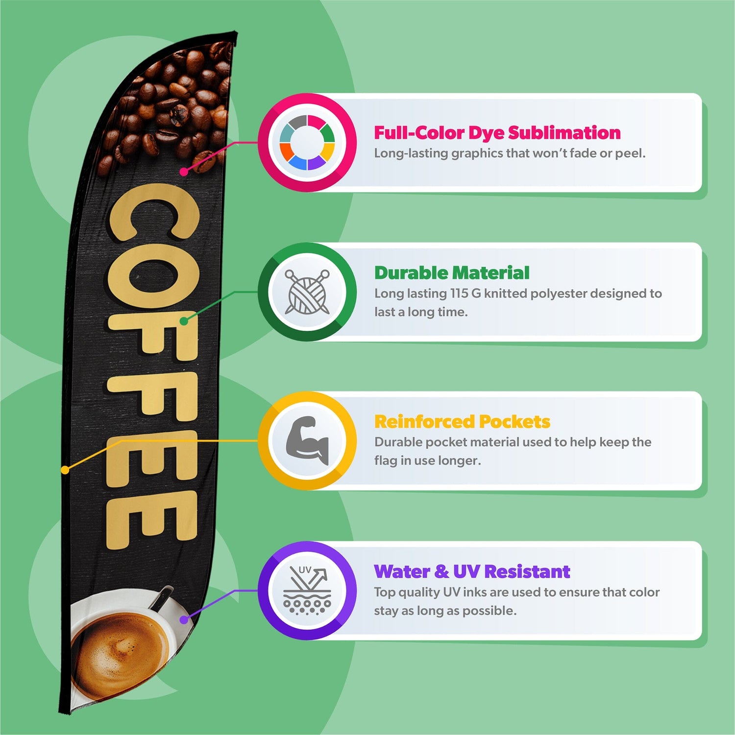 Perfect for cafés, coffee stands, breakfast spots, or drive-thrus, this high-impact flag adds instant energy and warmth to your curb appeal. It’s made from durable knitted polyester and printed in full color with stunning detail—built for outdoor use and built to get noticed.