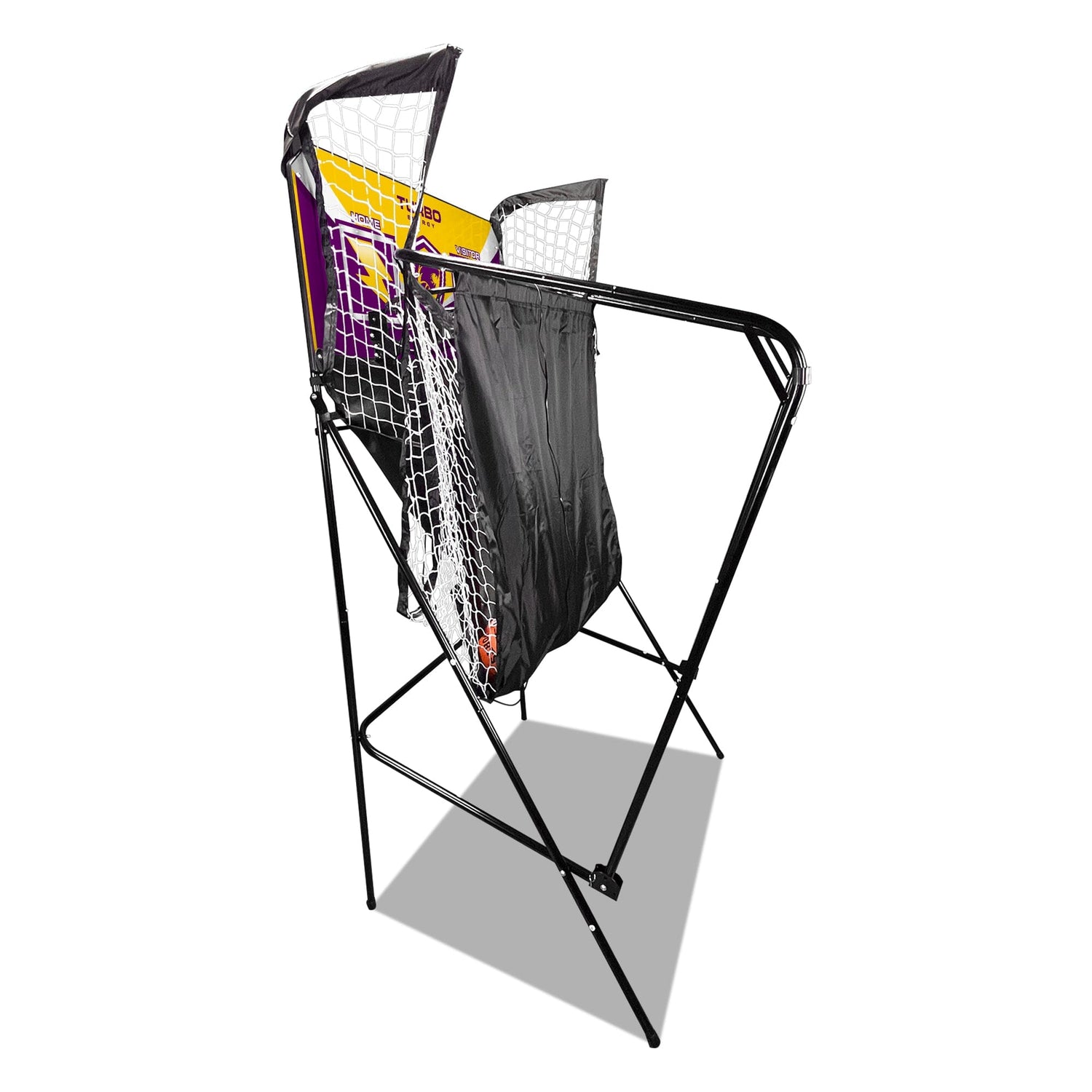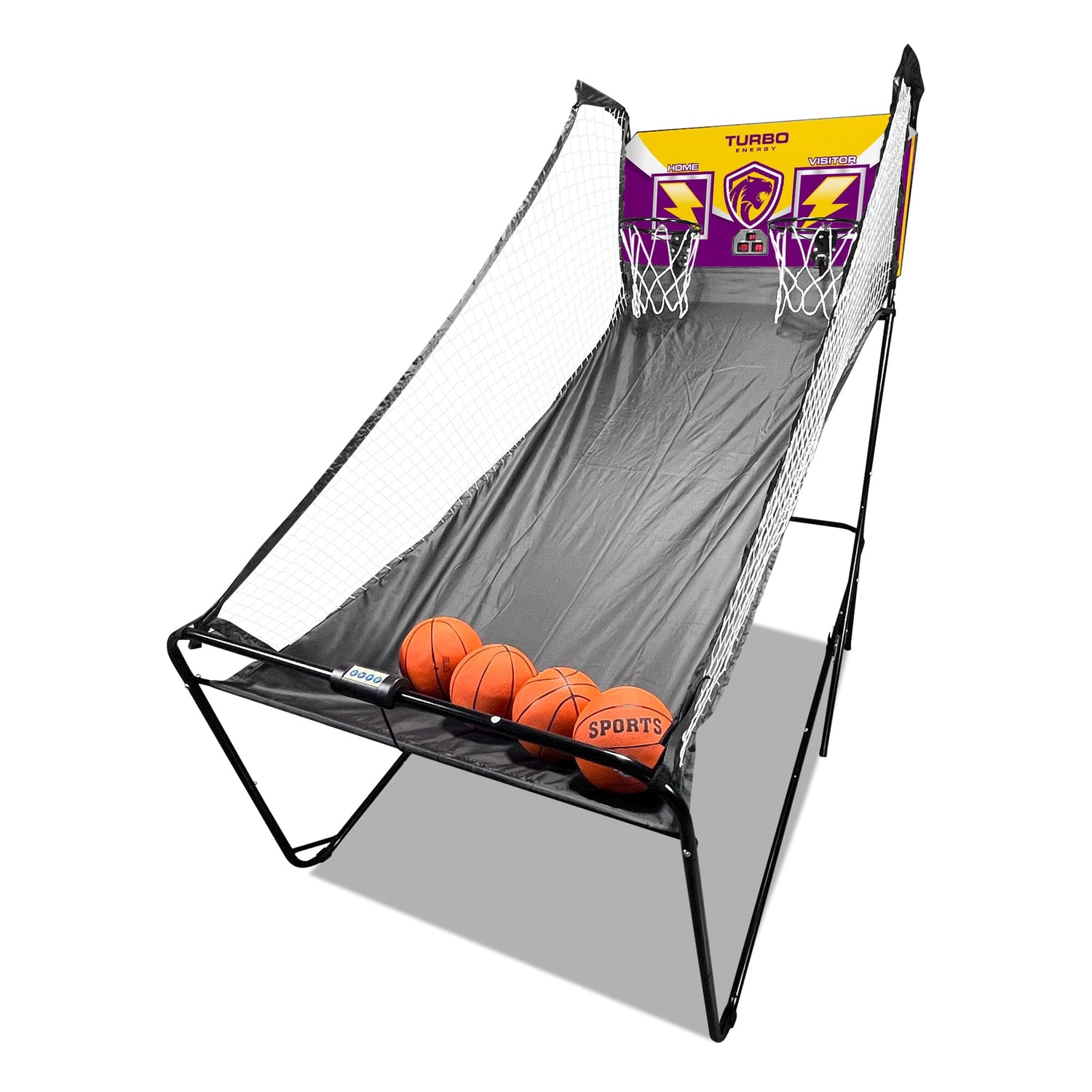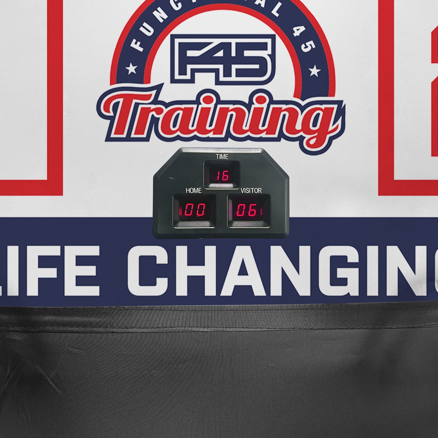 Your custom full-color backboard shows off your logo or team pride while players battle it out with LED scoring and a built-in timer. Built tough with a steel frame and black powder coating, this lightweight arcade favorite folds for easy storage and sets up in minutes with the EZ™ assembly frame.