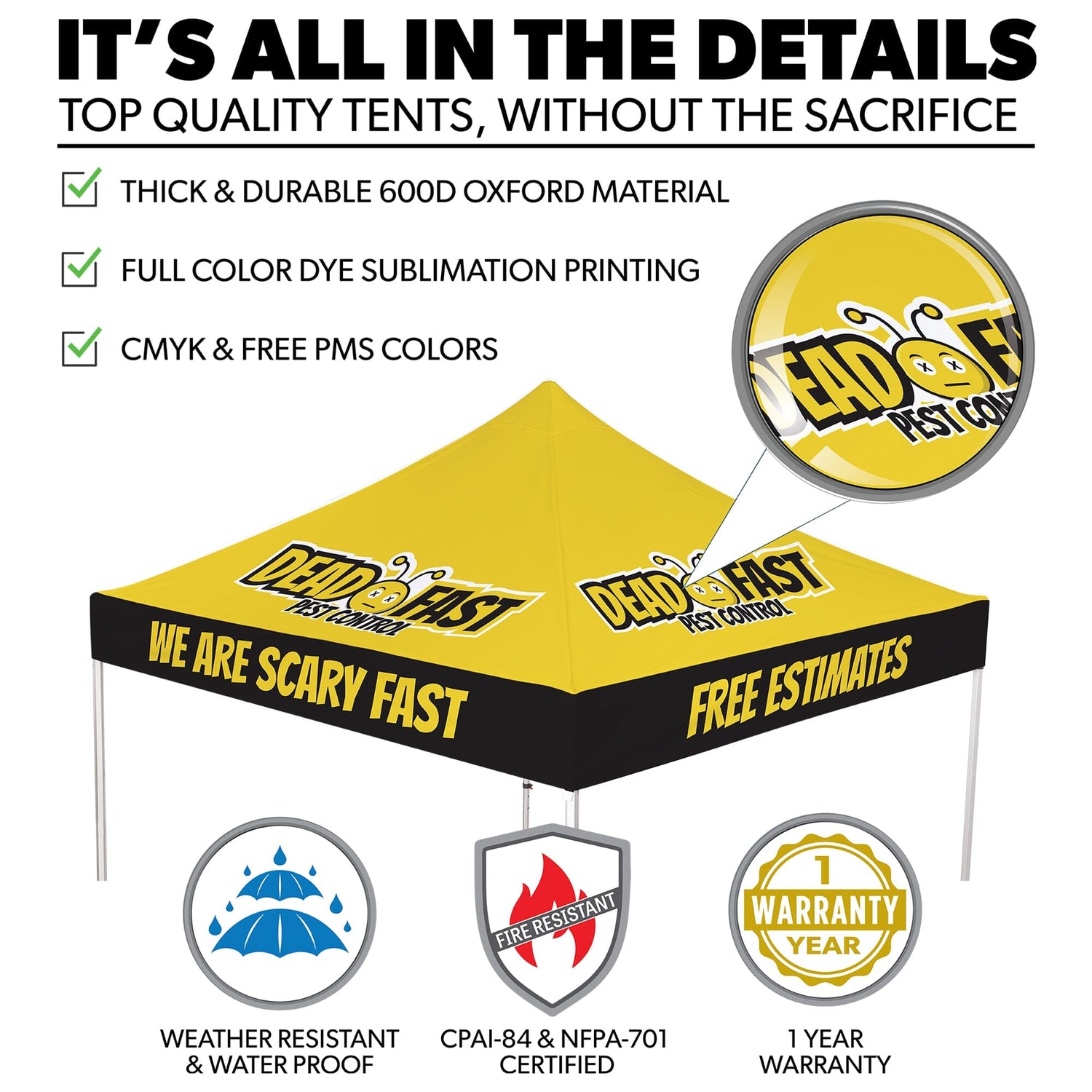 We use a dye sublimation process which gives the tent a clean and high-quality print look. This method is used with heat transfer creating vibrant colors and a special laminate layer providing additional production against UV and moisture. This printing method ensures a high-quality look and offers durability to endure normal outdoor weather conditions.