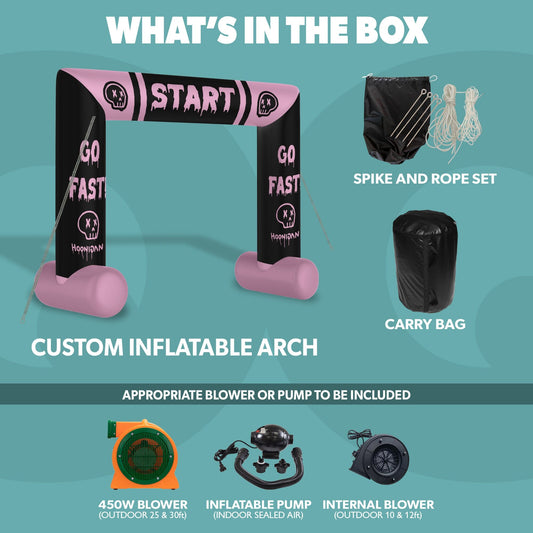 - Includes: Carry Bag, Sand Bags, Rope Set, Ground Spikes & (15 & 20ft = internal blower and 25ft & 30ft = External blower)