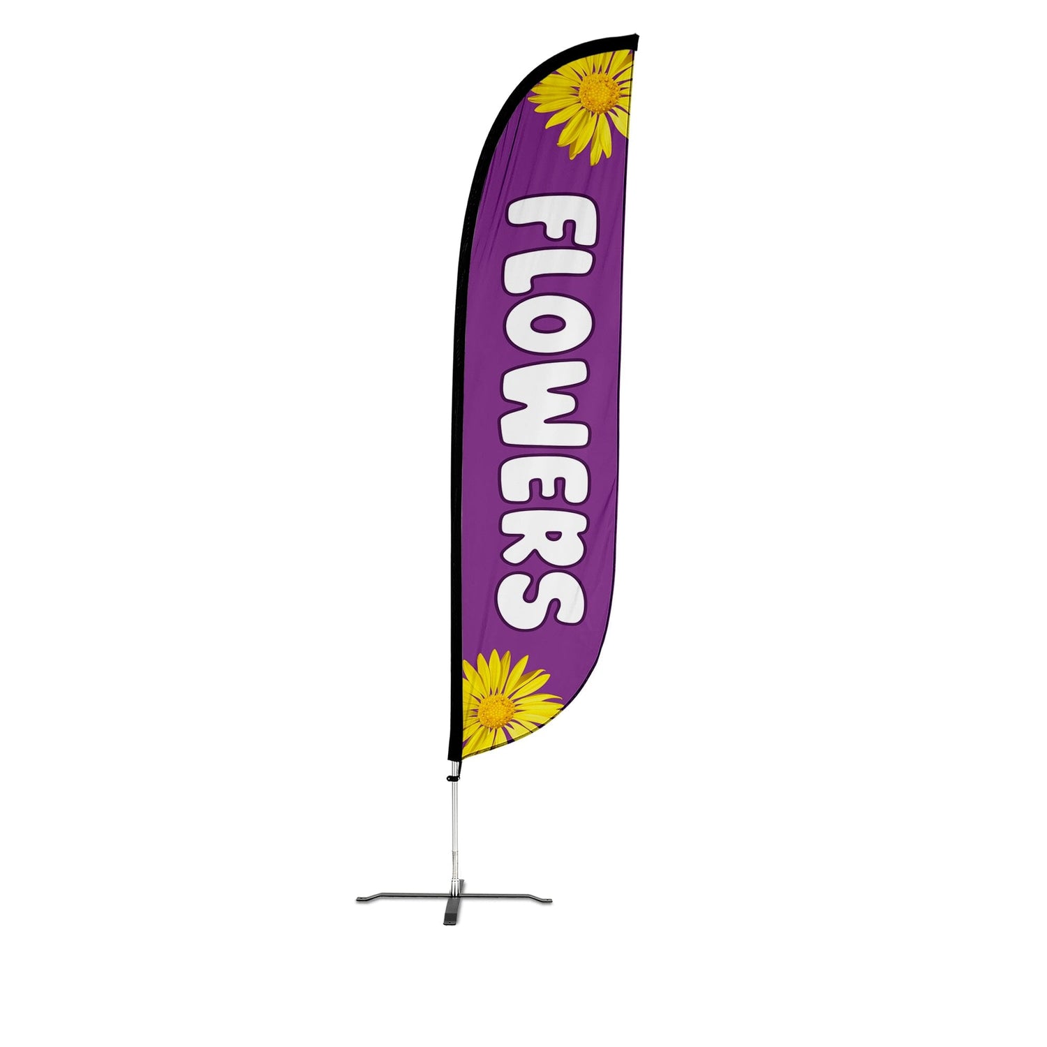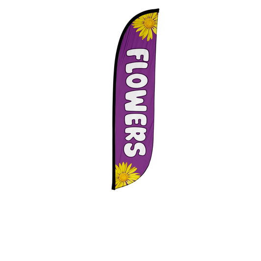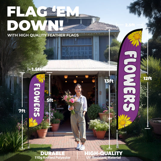 Turn your storefront or sidewalk into a floral magnet with this vibrant purple feather flag featuring bold white “FLOWERS” lettering and two cheerful yellow flower graphics—one at the top and one at the bottom. Designed to catch eyes and attract flower lovers from near and far, it’s the perfect way to boost visibility for florists, garden centers, farmers markets, or pop-up flower stands.