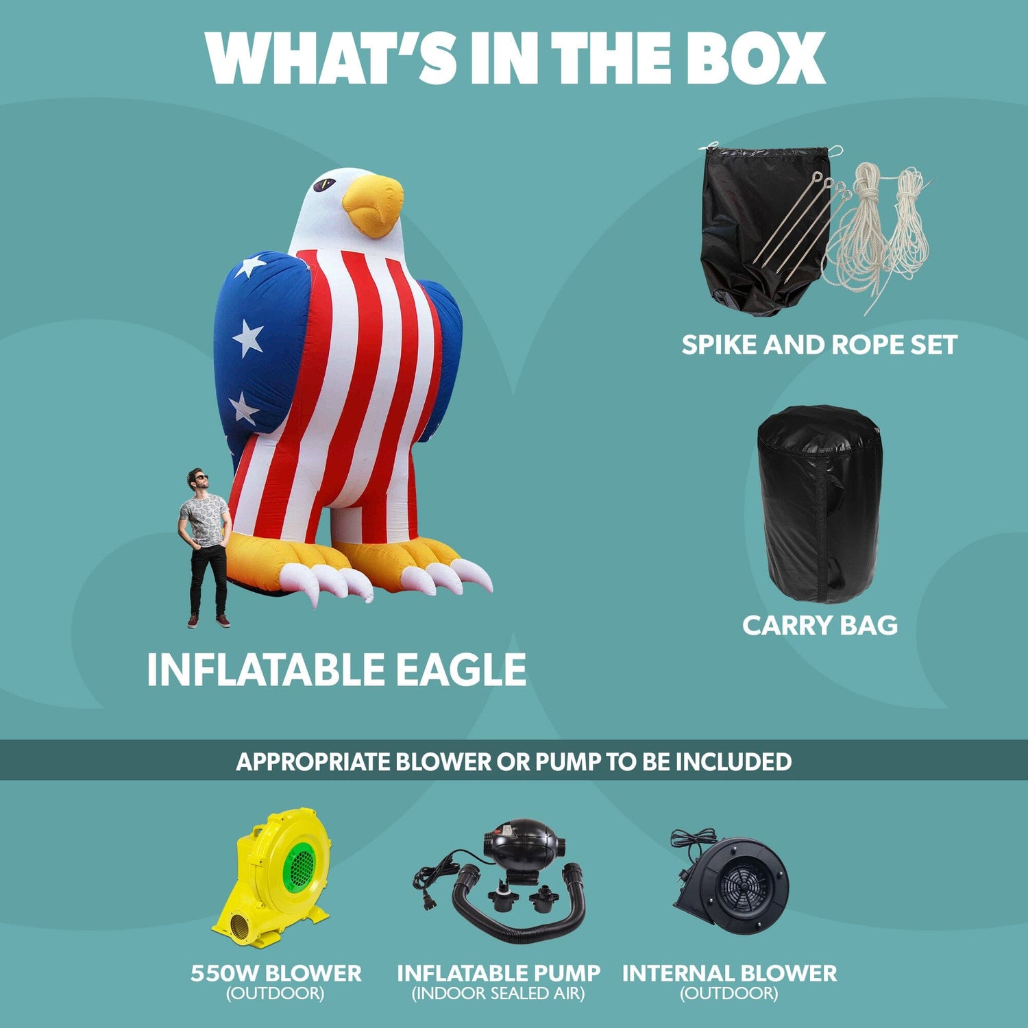 Standing over 20 feet tall and 10 feet wide, this giant inflatable eagle is designed to turn heads and draw in crowds at car dealerships, retail blowout sales, football games, grand openings, and more. Made from durable materials and built for both indoor and outdoor use, this inflatable is ideal for businesses, schools, and organizations looking to make a bold and patriotic statement.