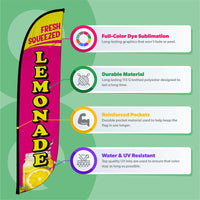 Nothing says “refreshing” like a bold lemonade flag waving in the breeze! Available in a 12-foot size, these vibrant feather flags are perfect for grabbing attention at lemonade stands, farmers markets, festivals, or any outdoor food and drink setup.