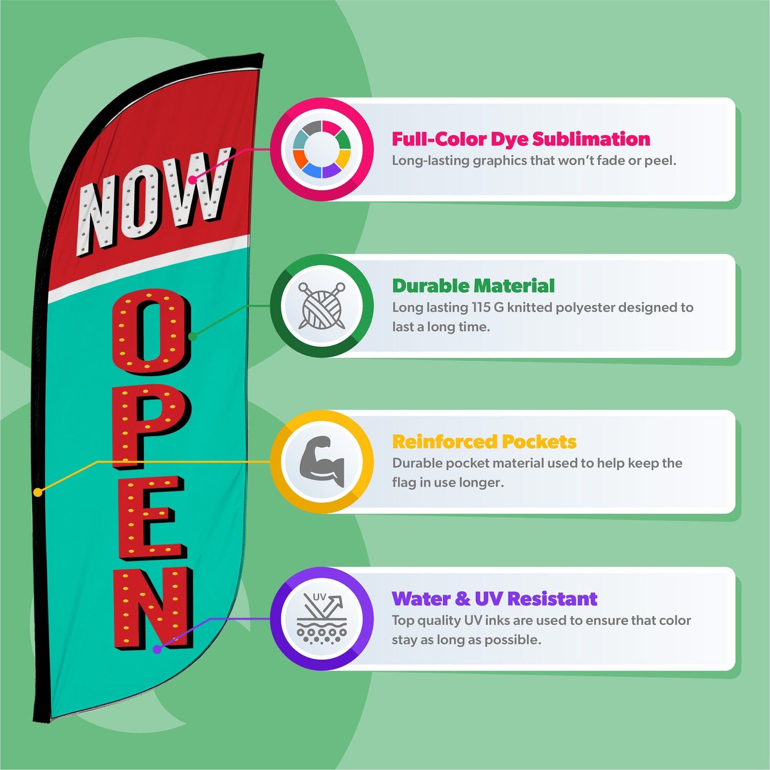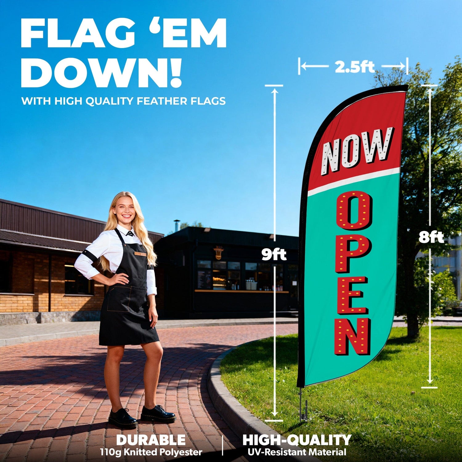 Our Now Open 8ft Feather Flags (Vintage Style) are a bold, ready-to-go solution for new businesses, reopenings, and seasonal locations. Featuring a classic vintage-inspired design, these flags create a welcoming, timeless look that draws attention from the street.