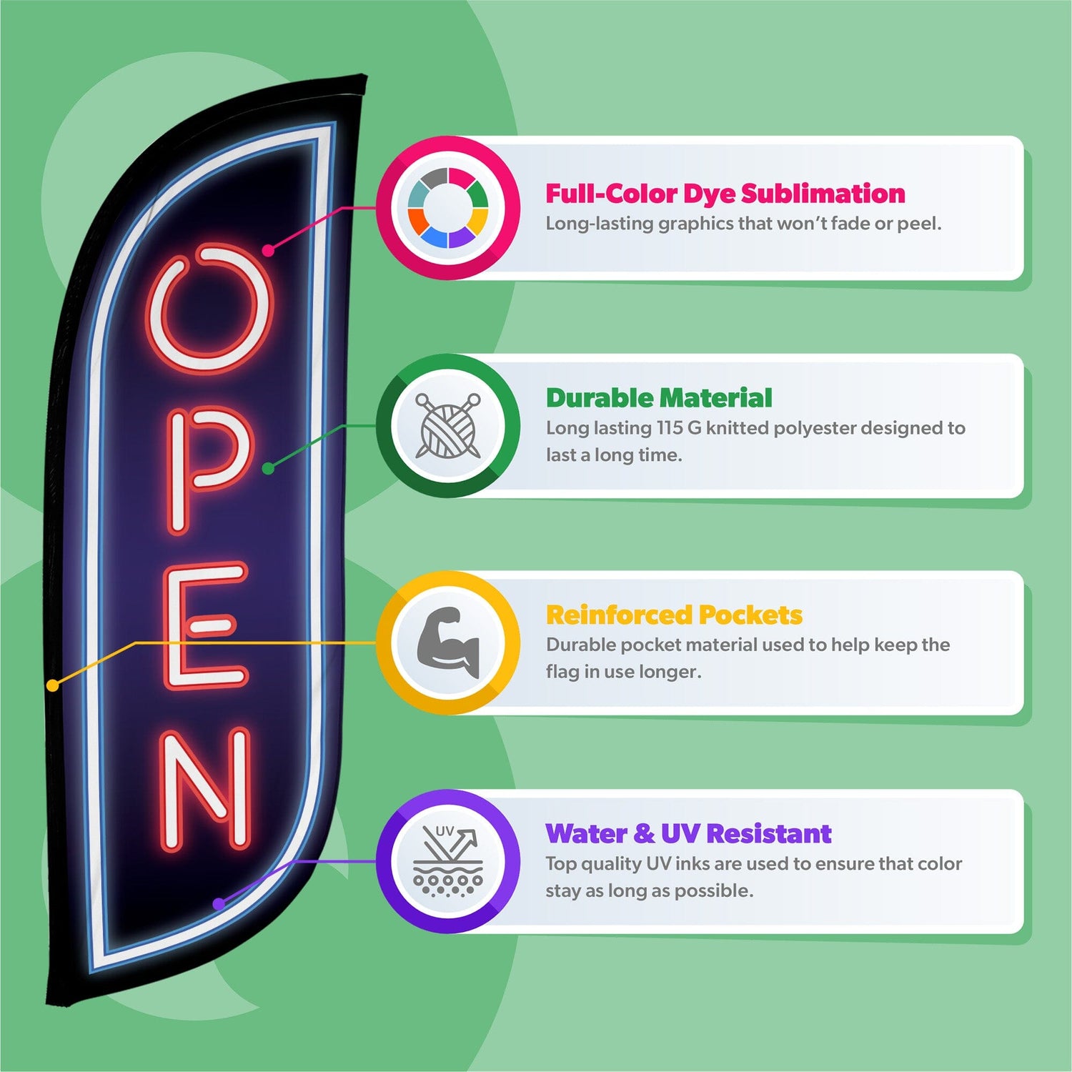 Built to handle outdoor conditions, these flags are durable, weather-resistant, and easy to set up, making them ideal for storefronts, sidewalks, parking lots, and roadside placement.