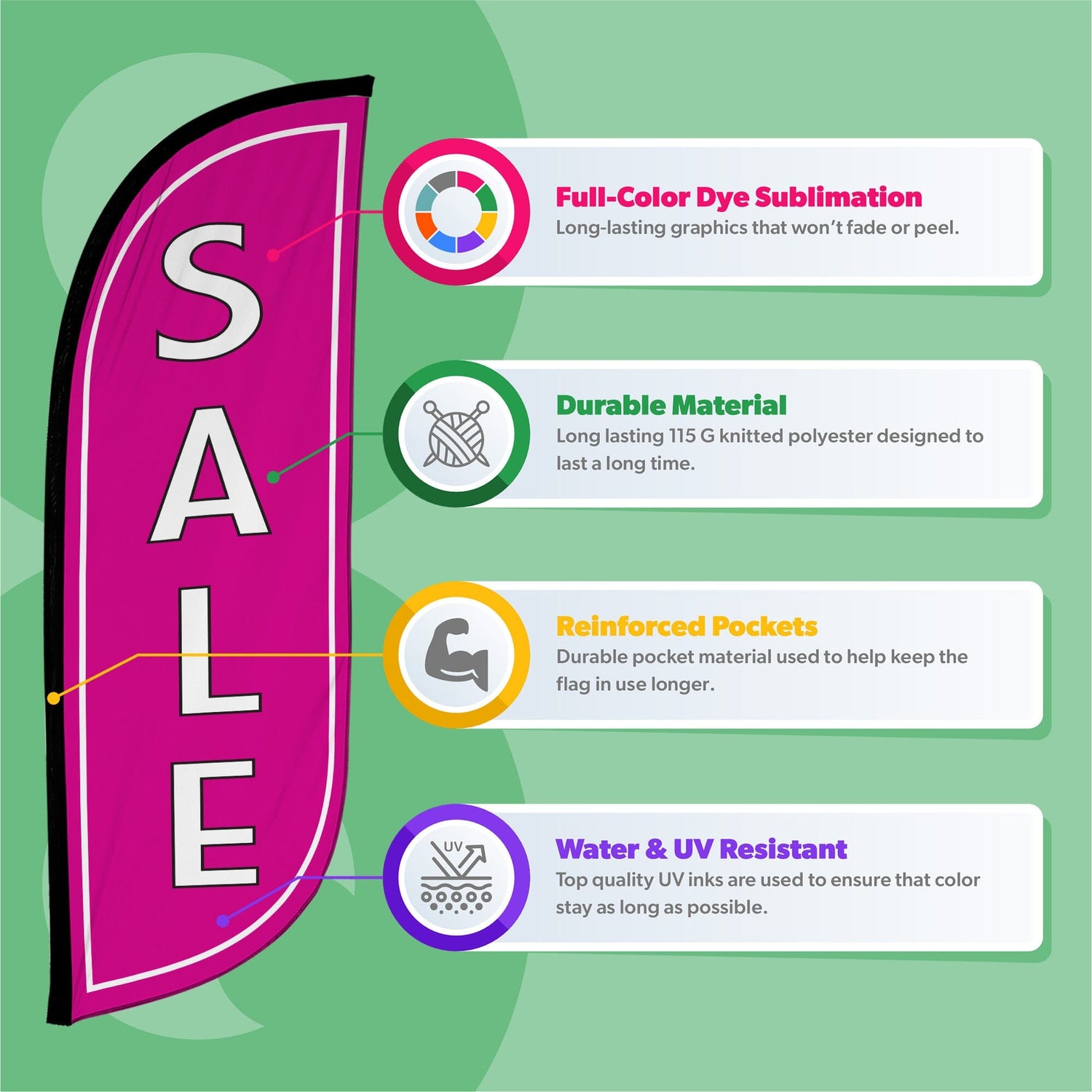 Our Pink Sale 8ft Feather Flags are a bold, ready-to-go solution for businesses promoting sales, specials, and limited-time offers. The bright pink design helps grab attention quickly and adds high-energy curb appeal.